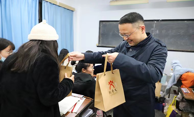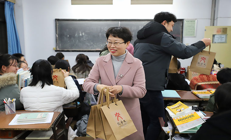 领导老师共同将学院精心准备的祝福大礼包发到考研学子手中,礼包中的暖贴寓意在学院、学校提供的保障下安心逐梦,士力架寓意鼓足勇气,坚定信念,咖啡鼓励学生将到顶峰更需振奋精神,苹果祝福考研之路圆圆满满。