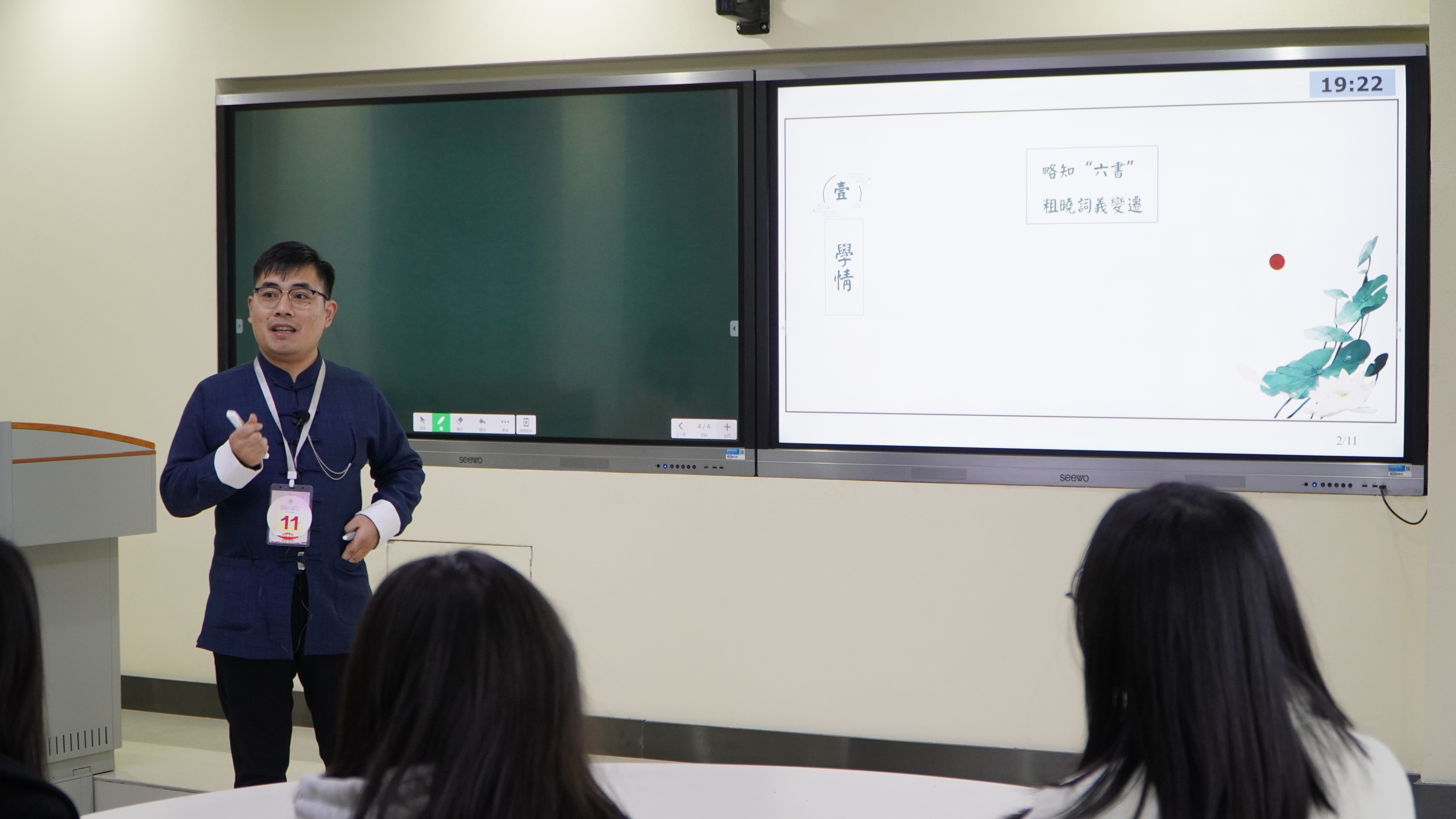 决赛中孙志波老师讲解了汉字的形声造字法,充分考虑学情,将古代汉语课程的教学方式由传授式、讲述式转变启发式、互动式,结合最新的音韵学、文字学研究成果,细致梳理了形声造字法的原理,剖析了字形、字义、字音之间的关系,把艰涩的古代汉语变得生动富有趣味,在比赛中获得评委的一致好评。