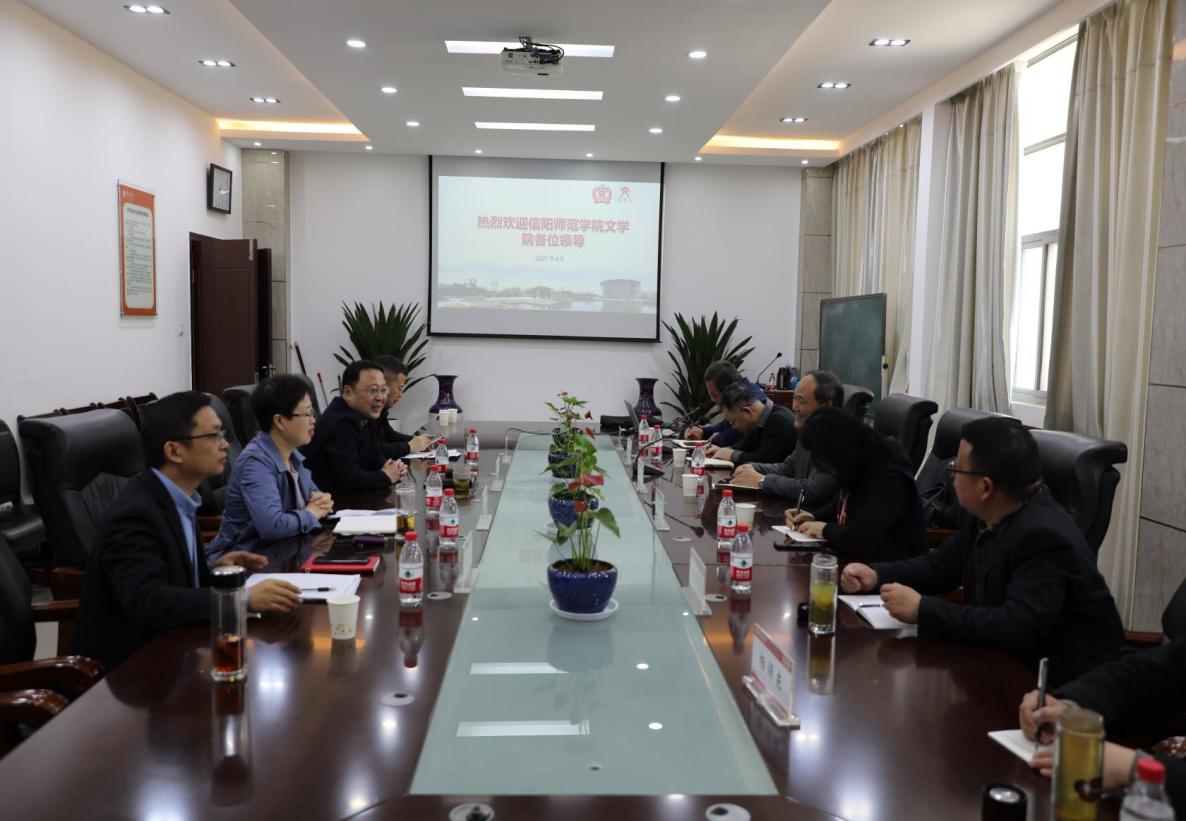 4月15日上午,信阳师范学院文学院党委书记吴圣刚、院长沈文慧一行莅临我院进行考察交流,交流会在崇文楼二楼会议室举行,我院党委书记段勃、院长赵黎波、副院长陈鹏、李占伟参加本次交流会。