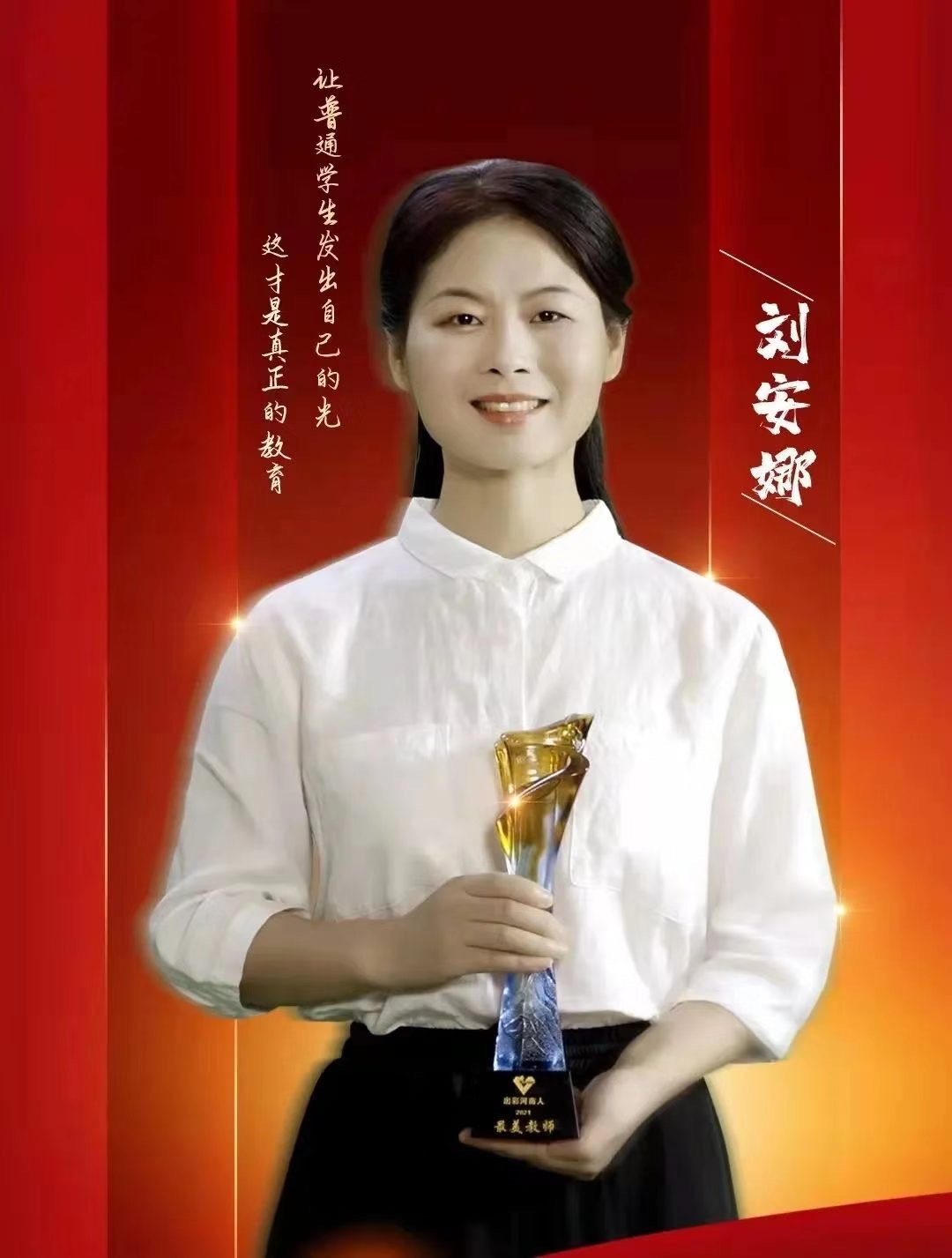 发布仪式上,刘安娜老师以“因博学备受学生追捧的‘偶像教师’”为事迹关键词亮相。主持人在其颁奖词中指出:“博学多才、挥洒自如,你是学生追捧的偶像;春风化雨、水到渠成,你是学生知心的姐姐。课堂因材施教,课下网络互联。你执念,‘教书育人,非一课之功’;你坚信,付出真爱,爱就永不泯灭。你是‘出彩河南人’2021最美教师——刘安娜。”