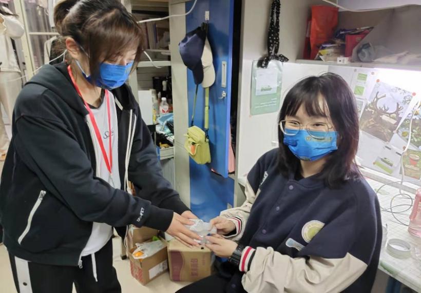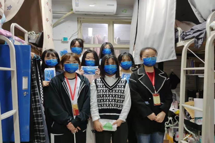 导航员及时向学院学生发放了一次性医用外科口罩,以宿舍为单位发放医用抑菌洗手液,并对学弟学妹们做出了如下关切:在坚持科学佩戴口罩,保持社交距离的同时,要进行宿舍日常的清洁消毒。与此同时,要积极反馈自身的健康状况,主动做好日常的心理疏导。“学姐们送来的物资和叮嘱,让我们感受到了学院对学生的重视。听到她们说一定照顾好自己身体的时候,心里感觉很温暖!”东十二宿舍的2021级同学徐维聪笑着说道。