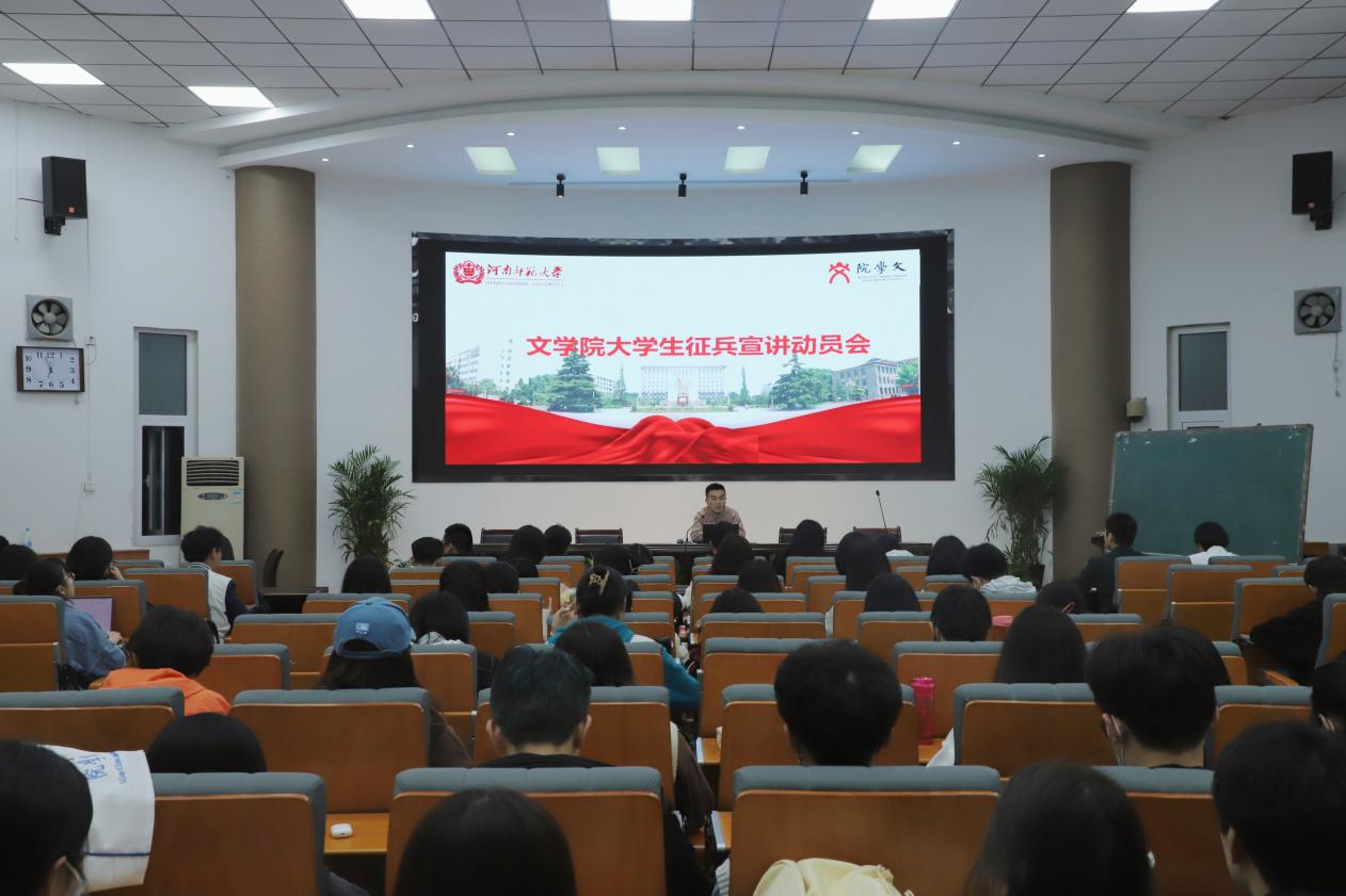 3月30日晚,文学院大学生征兵宣讲动员会在崇文楼一楼报告厅召开。文学院2021级专职辅导员陈培超主持会议,2020级专职辅导员桑庆芳、各年级兼职辅导员、2021级全体学生及2020级部分学生参加会议。
