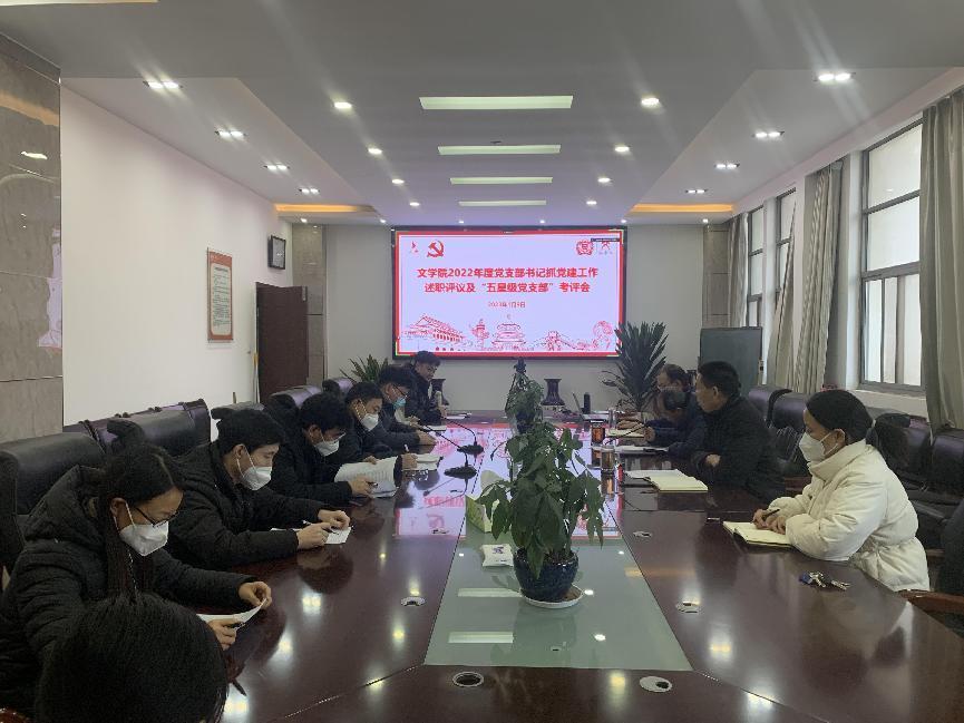 1月9日下午,文学院2022年度党支部书记抓党建工作述职评议及“五星级党支部”考评工作会在学院二楼会议室召开。学院处级干部、党委委员、各支部书记、支部委员及师生党员代表以线上线下相结合的方式参加会议。会议由学院党委书记孙昌松主持。