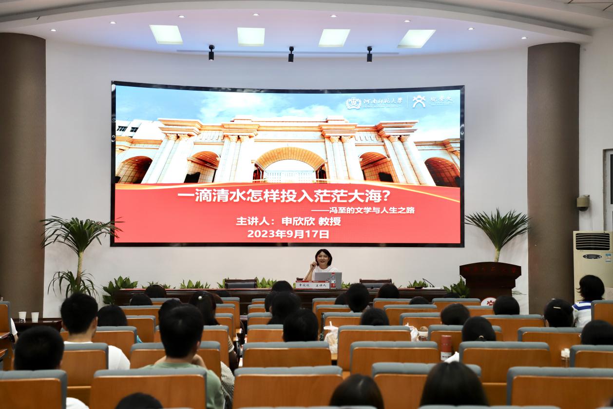 9月17日晚,文学院“悦读红色经典,培育时代新人”系列讲座于崇文楼一楼报告厅中举行。学院副教授申欣欣作题为“一滴清水怎样投入茫茫大海——冯至的文学与人生之路”的讲座,学院近百名学生参加讲座。