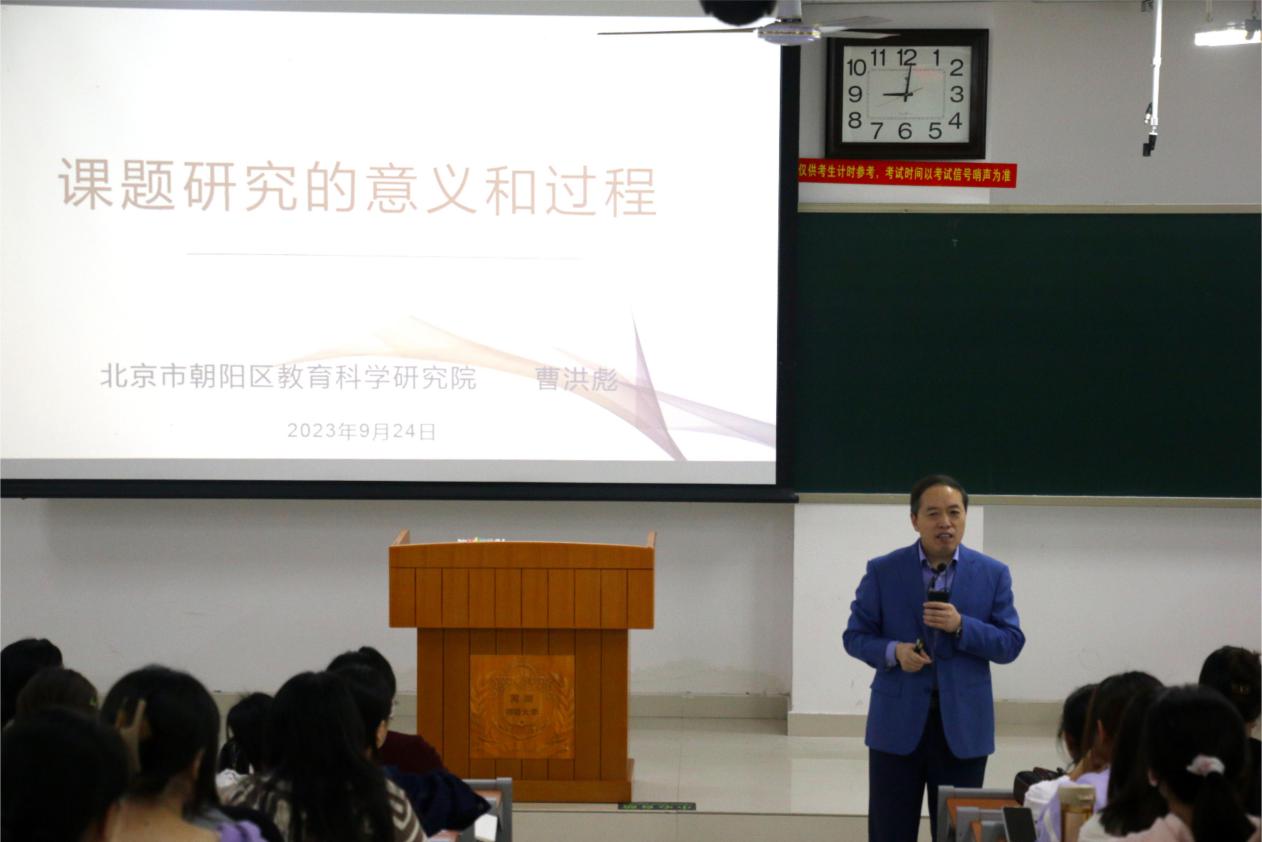 曹洪彪从不同教师对于课题研究不同的理解引入主题,围绕什么是课题研究、课题研究的意义、课题研究的过程、课题研究的启发四个方面来展开阐述讲座主题。他讲述自身的课题研究历程与成果,鼓励同学坚持做一件事、做好一件事。曹洪彪介绍了教师工作的四种境界,提出要做科研型教师、教育家型教师,助力国家教学改革。他表示,学习的过程分为学明白、能运用、会感悟三个层次,学生掌握了学习方法才能探索真理,总结规律。曹洪彪为同学们分析如何学习才能效果好,鼓励学生带着使命学习、带着问题学习、带着感悟学习。曹洪彪分享自身课题研究的过程与启示,告诫学生在课题研究过程中要坚定理想信念、坚守勤奋刻苦、坚持反思感悟。在讲座互动环节,曹洪彪对学生提出的如何提高学习专注力、如何引起对语文的重视等具体问题给予详细的回答。