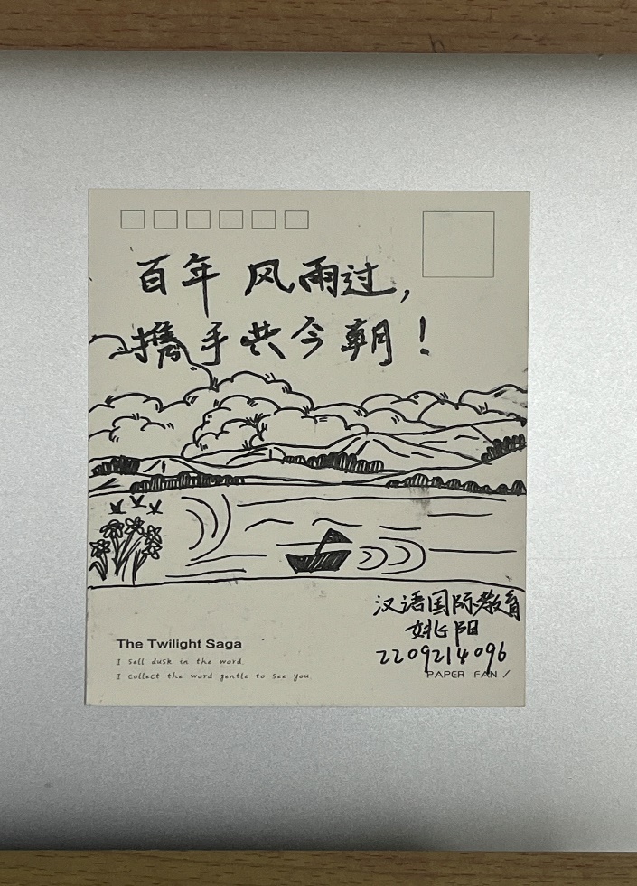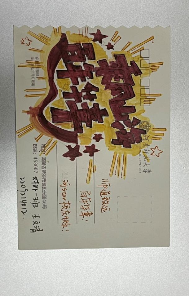 同学们利用课余时间在明信片上进行彩绘创作,笔墨传情,字里行间是对师大深厚的祝福,明信片已然成为学子与师大的情感的桥梁。其中有些借助诗人的文字力量表达对祖国的热爱与祝福,有些则是以勾勒简化、图文并茂的方式赞美伟德官网下载苹果版的百年华章。明信片中“乘风山海,礼赞华章”,“百年风雨过,携手共今朝”,“百年师大,风华正茂”等赞美伟德官网下载苹果版100年校庆的话语,是对伟德官网下载苹果版100年的过往追忆,同时也是对师大最美好的祝福。每一张明信片、每一段文字、每一幅图画,承载着殷切的期盼和满满的希冀,包含着文学院学生对伟德官网下载苹果版一百年校庆的祝福、期待与热爱。