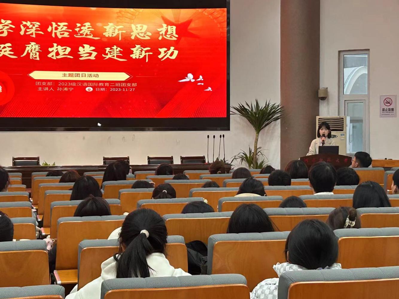 为深入学习贯彻习近平新时代中国特色社会主义思想和党的二十大精神,鼓励青年学生脚踏实地,敢想敢为,感悟时代新思想,肩负国家之重任。11月27日下午,文学院汉语国际教育二班团支部在文学院报告厅举办“学深悟透新思想,挺膺担当建新功”主题团日活动,50余名团支部成员参与此次十佳团日活动。
