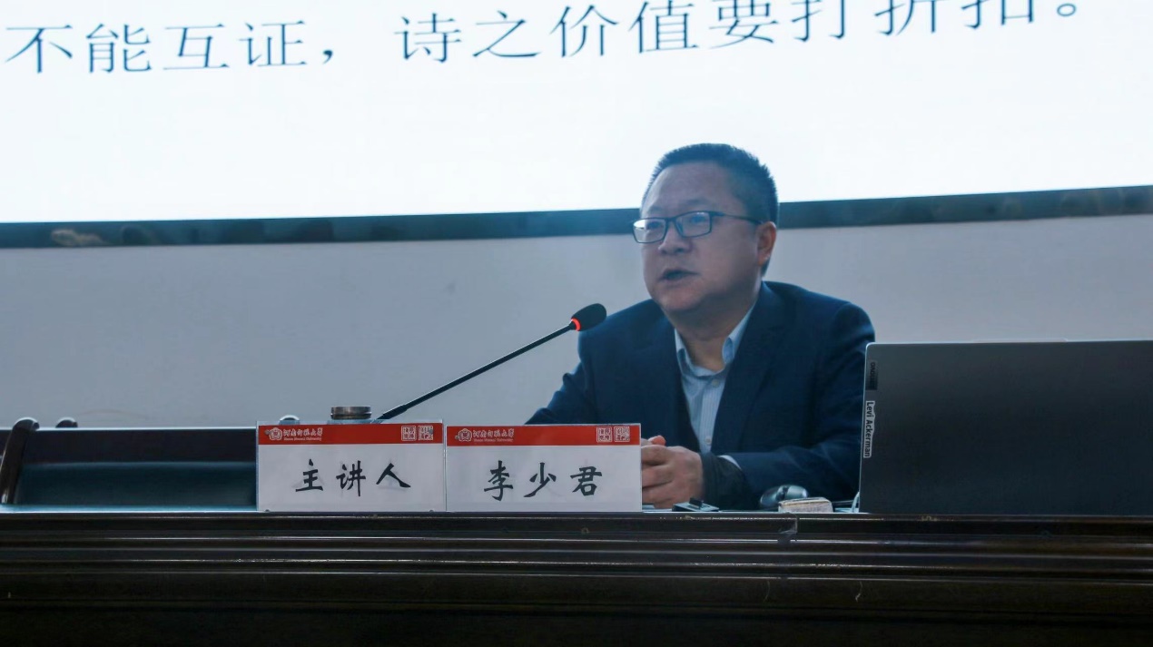 以《赠汪伦》和《红楼梦》等文学作品为例,李少君分析了诗词与小说、散文之间的区别,阐述了“诗人为何是‘人’而不是‘家’”的原因,点明诗歌具有呈现诗人自我的特点。为了引出“人诗互证”的观点,他讲述了自己从误解林徽因到通过林徽因的诗歌逐渐了解到真实的她这一故事。针对古典诗歌,李少君以《唐史》部分推测情节的模糊,与唐诗对时间、地点、人物、情感的清晰描写进行对比,论证得出中国诗词注重现实感、现场感,讲究实情实景。借杜甫和苏轼的诗作及生平事迹,他阐述了诗歌“以诗证史”的特点,更深一层地传达出中国诗歌自我超越的特性。通过分享自己所作的诗歌和对毛泽东诗词的研究,他强调了诗歌的重要性和文字的伟大力量。在讲座互动环节中,李少君对学生们提出的“人与诗在相互影响中谁更重要”的疑问进行了耐心细致的解答,并表明在诗歌中诗人的主体性价值。