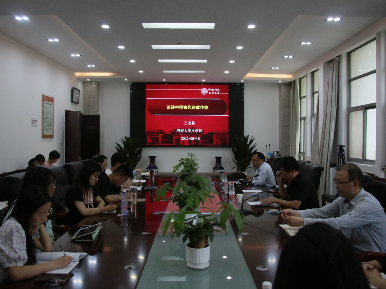 516日下午,河南大学王宏林教授应邀做客“卫风讲堂”,在崇文楼二楼会议室为文学院师生作题为“漫谈中国古代的诗歌传统”的学术讲座。讲座由文学院学术委员会主任周相录主持,学院师生积极参加学习。