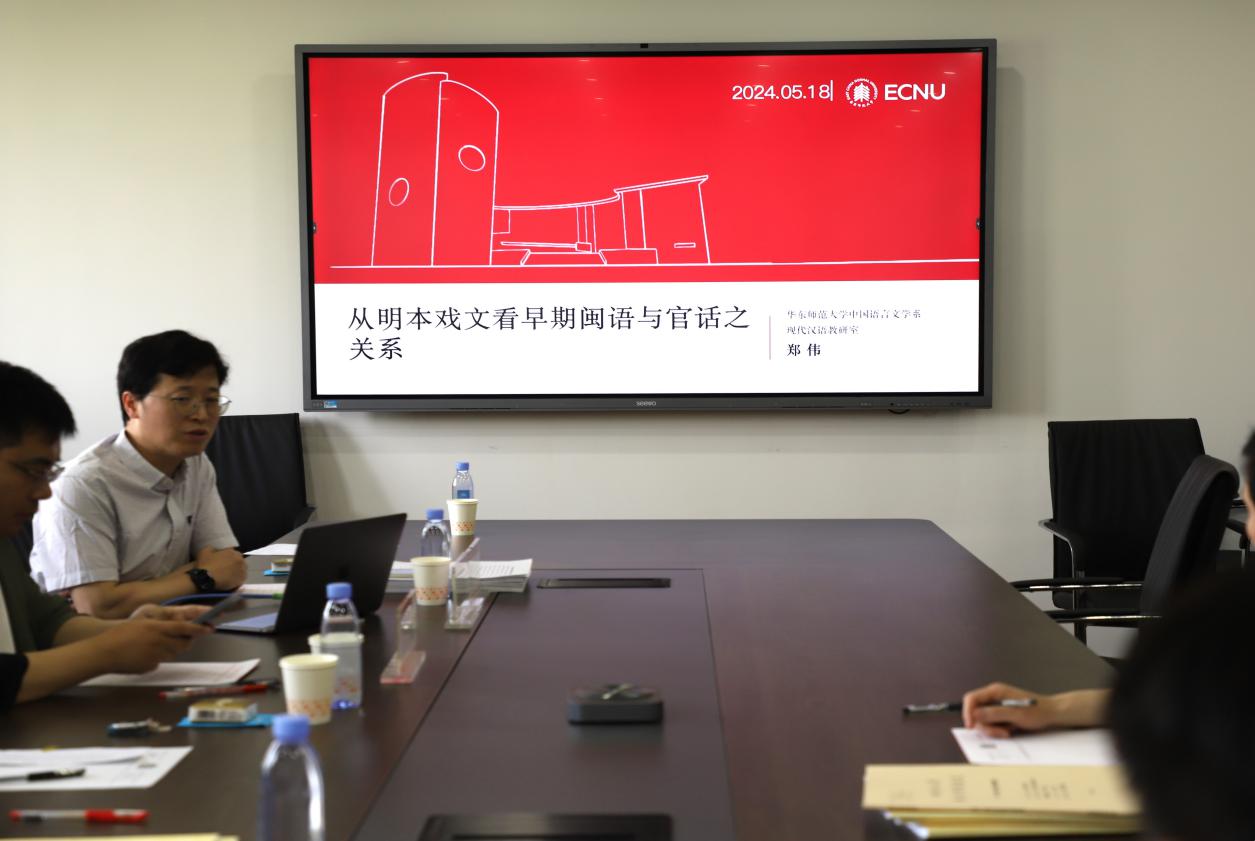 郑伟从明本戏文中的官话成分、明本戏文中的闽音成分与语言风格的分层特征三个方面探究早期闽语与官话之关系。以明代戏文《金钗记》《白兔记》为例,郑伟分别对句法层面的戏文念白、俗字用字与唱念押韵进行深入分析,并从其中得出“正音”特点。他表示,南戏潮州音中存在“持”“提”混读、“潭”“堂”混读等声母、韵母混同现象,戏文中部分字的唱念押韵是潮州音“官话化”折合的结果。通过比较“唱词”与“念白”的用韵差异、“韵脚字”与“句中字”的用韵与声调差异,郑伟提出,“唱词”比“念白”含有更多的“正音”特征,受流行地区不同的影响,明代南戏存在本地化的特征。在讲座互动环节中,郑伟对师生提出的“为什么选择《金钗记》作为研究对象”“‘每’与‘们’的来源问题”等问题作了详细解答,并与在场教师就南北方言差异进行进一步探讨。