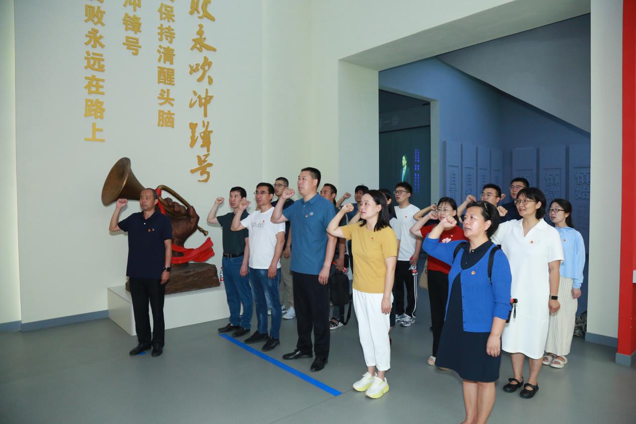 参观后,全体党员代表面对党旗庄严宣誓,重温入党誓词。