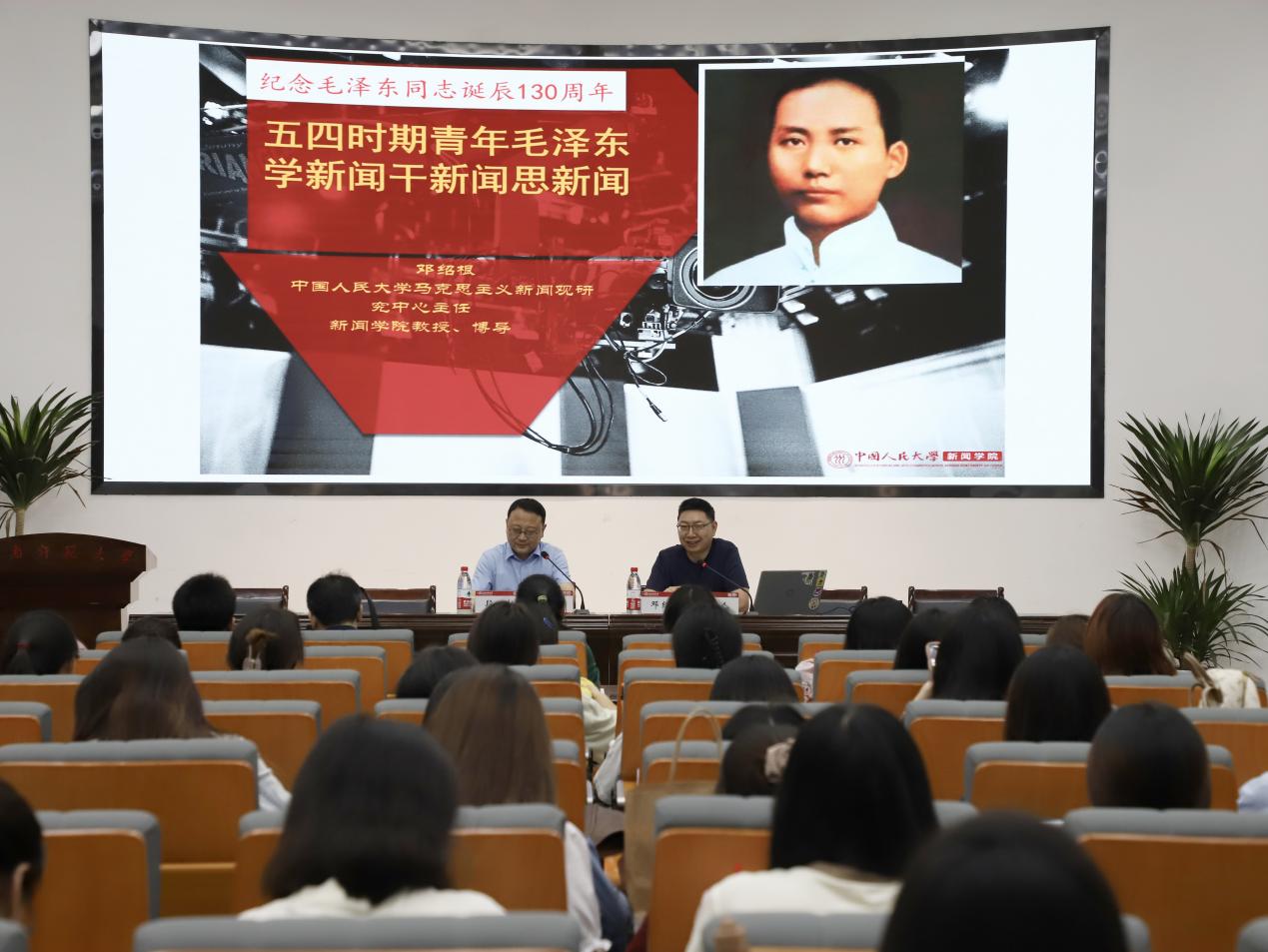 邓绍根围绕“学新闻”“干新闻”“思新闻”三方面对青年毛泽东的新闻学习过程进行讲解。他指出,今年是纪念毛泽东同志诞辰130周年,希望通过介绍毛泽东的生平经历,促使学生深入了解五四时期的热血青年对中国新闻事业建设做出的卓越贡献。关于毛泽东“学新闻”方面,邓绍根提出读书看报是毛泽东成长、成才、成功的重要途径,读书看报的习惯贯穿毛泽东的人生生活。他认为,正是对民族前途命运的深切关注,毛泽东坚定地报名参加北京大学新闻学研究社,后在北大新闻研究社取得丰厚收获。对于毛泽东“干新闻”,邓绍根列举了毛泽东在1919年至1921年间参与主编的周刊报纸,向在座师生展示了他在《晨报》上发表的文章。在毛泽东“思新闻”方面,他讲述了青年毛泽东的马克思主义新闻观的形成过程,并对“踏着人生社会的实际说话,实事求是”等马克思主义新闻观做出深入解读。邓绍根表示,毛泽东在革命历程中积累的新闻工作经验奠定了中国共产党新闻舆论的理论基础,毛泽东的新闻历程激励在座学生要有信心地去努力读书。