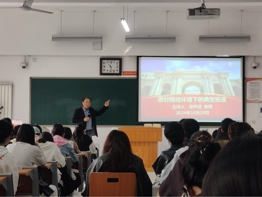 10月28日上午,湖北大学廖声武教授应邀做客“卫风讲堂”,在文昌楼313教室为学院师生作题为“做好网络环境下的典型报道”的学术讲座。讲座由文学院副院长屈会超主持,学院师生积极参与学习。
