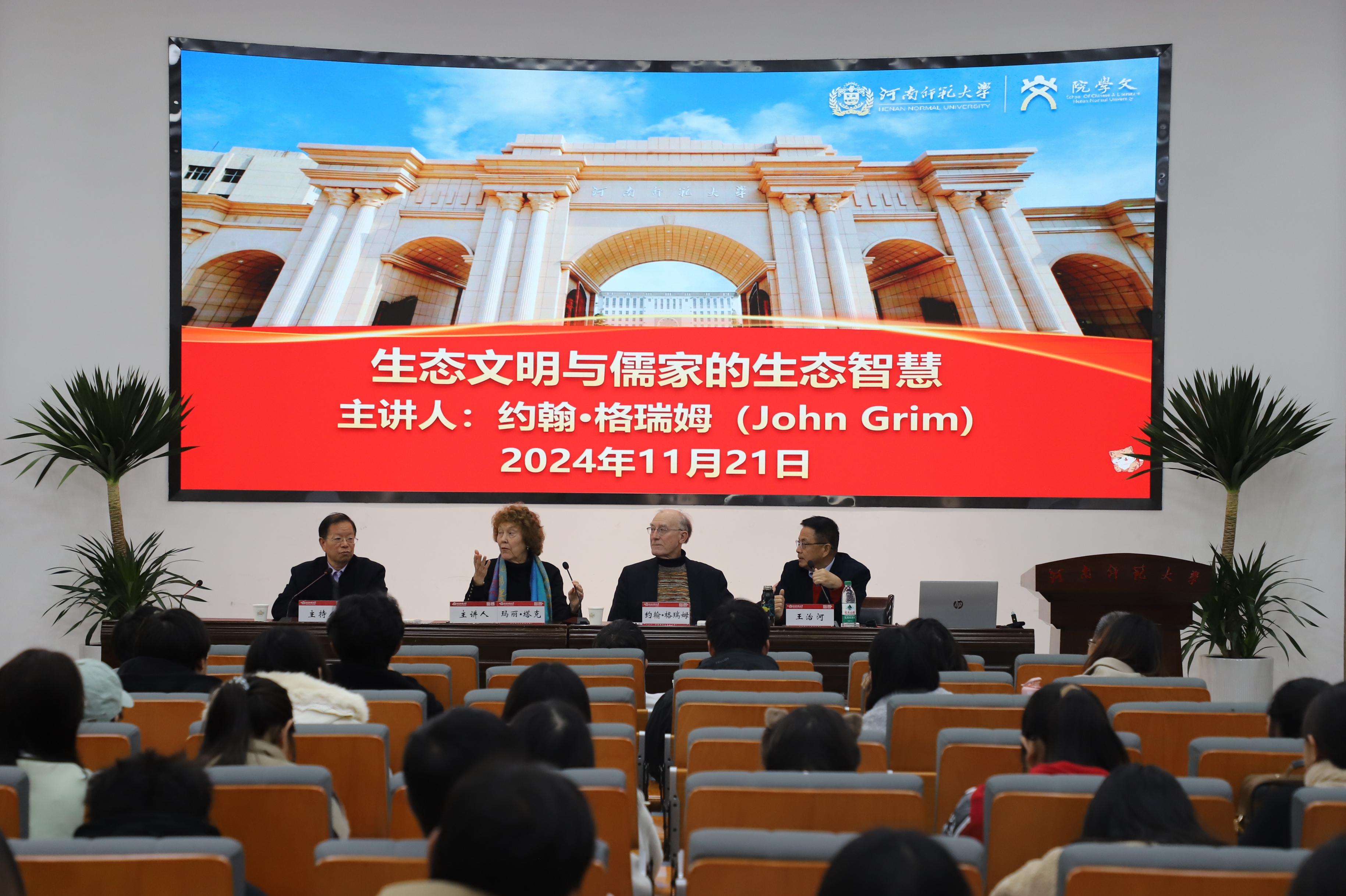 1121日,耶鲁大学玛丽·塔克教授与约翰·格瑞姆教授来我校交流访问,在崇文楼一楼报告厅与文学院师生就生态文明话题展开交流。交流会由中原非物质文化遗产保护研究中心主任丁永祥主持,学院师生参与学习交流。