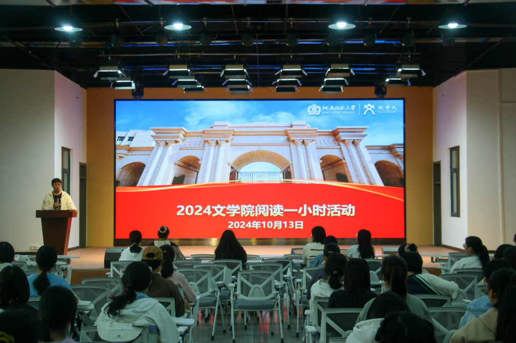 活动开始,2024级汉语言文学专业学生代表王帅博与崔新易上台分享好书。王帅博分享了对《毛泽东选集》第一卷的理解,表示《毛泽东选集》是当代青年追求信仰的重要指南,毛泽东精神仍在当代青年身上流动,激励青年学生学习伟人思想,争做新时代青年,引发在座学生共鸣。崔新易分享了自己对《百年孤独》的感悟,以“破译”为主题从拉美文明联系到中国历史,强调了历史和文化对一个民族的重要性,以加深学生对于书籍的理解。分享环节结束后,全场学生共同参与了一小时的沉浸式阅读,放下手机,回归纸质阅读,与书香同行,与良友为伴。