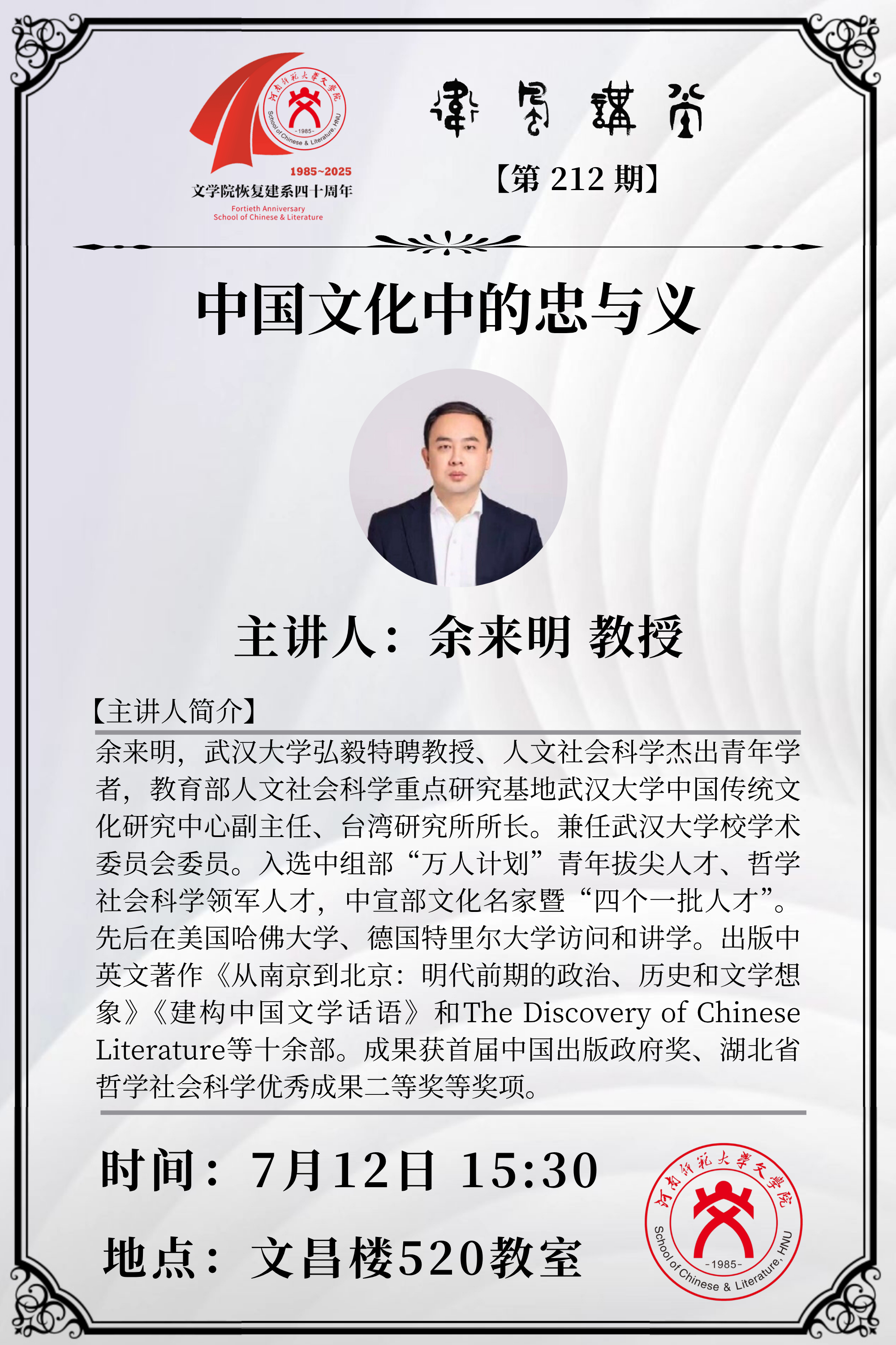 武汉大学余来明教授讲学预告