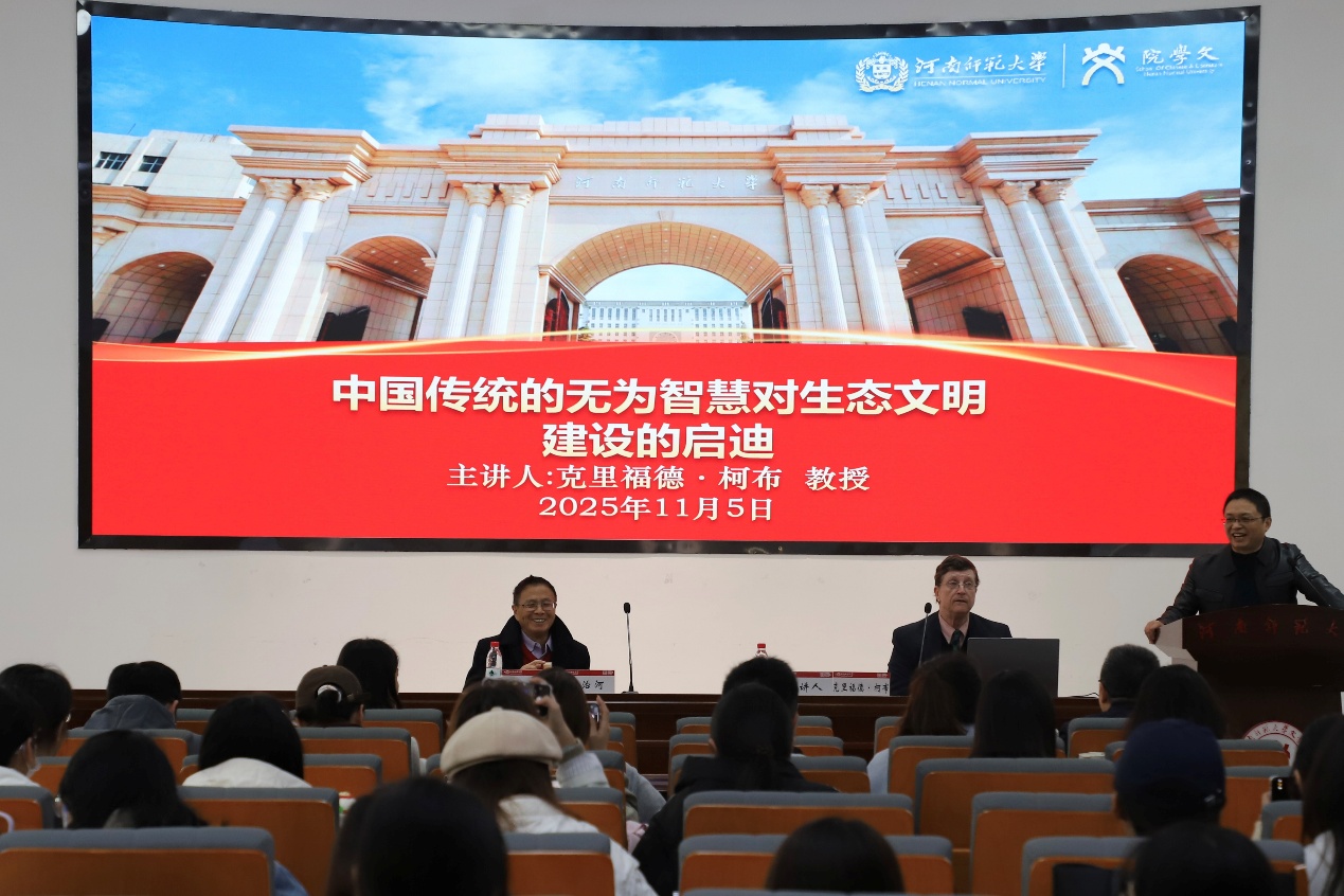 11月5日上午,美国中美后现代发展研究院副院长克里福德·柯布教授应邀做客“卫风讲堂”,于崇文楼一楼报告厅为学院师生作题为“中国传统的无为智慧对生态文明建设的启迪”的学术讲座。讲座由中美后现代发展研究院执行院长王治河主持,学院百余名学生积极参加学习。