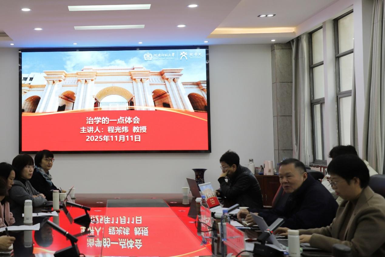 11月11日上午,中国人民大学程光炜教授应邀做客“银龄讲堂”,在崇文楼二楼会议厅为文学院师生作题为“治学的一点体会”的学术报告。讲座由文学院赵黎波教授主持,学院四十余名学生参与。