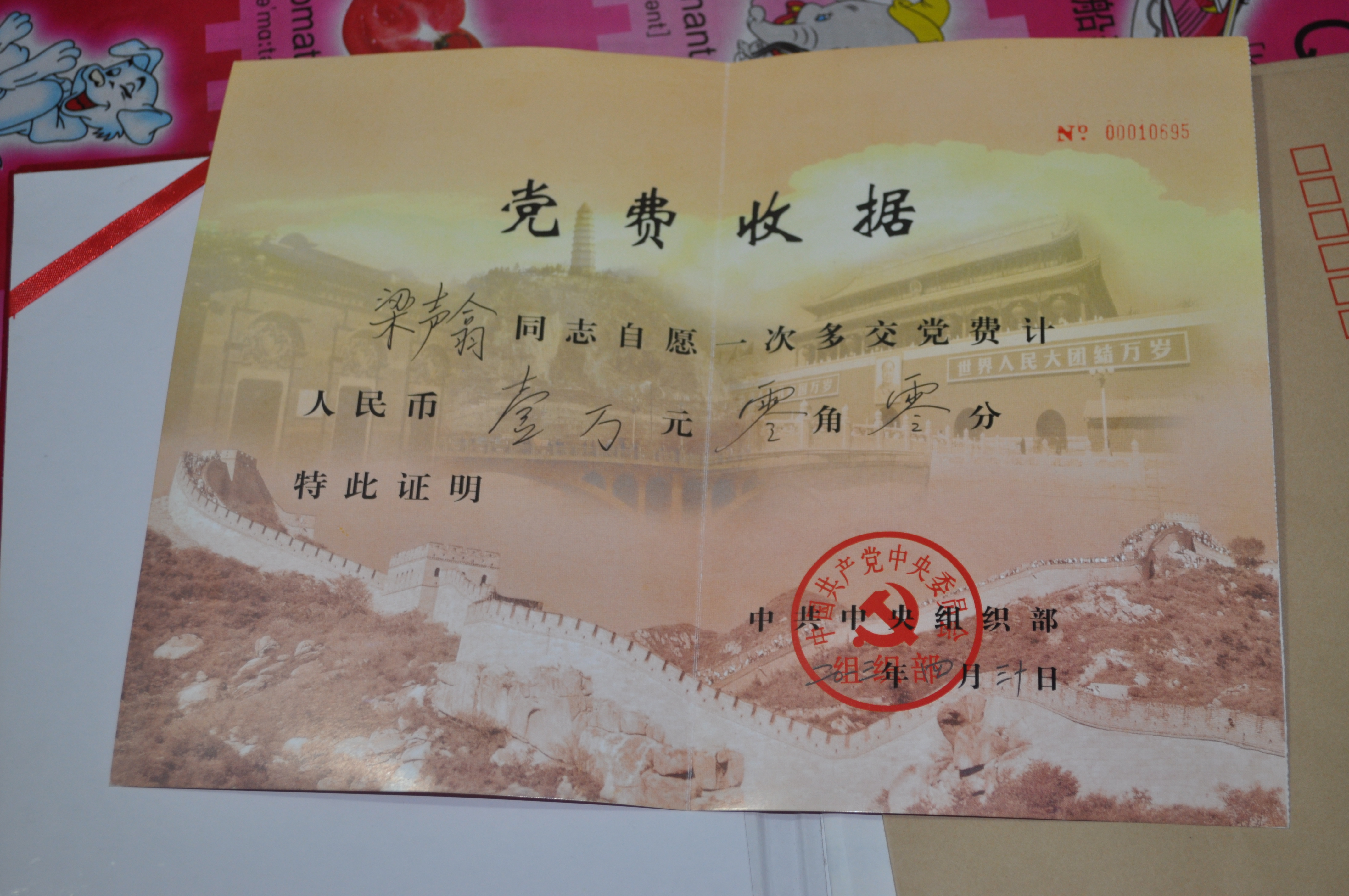 梁声翕老人上交中共中央组织部党费收据