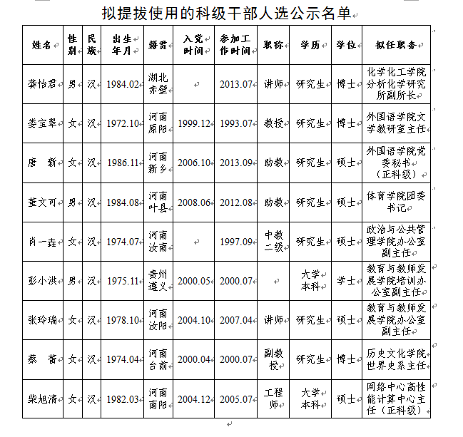 根据干部选拔任用工作的有关规定,现对拟提拔使用的科级干部人选进行公示,请予监督。如对拟任人选有不同意见,请于2015年5月10日之前向校纪委或组织部反映。